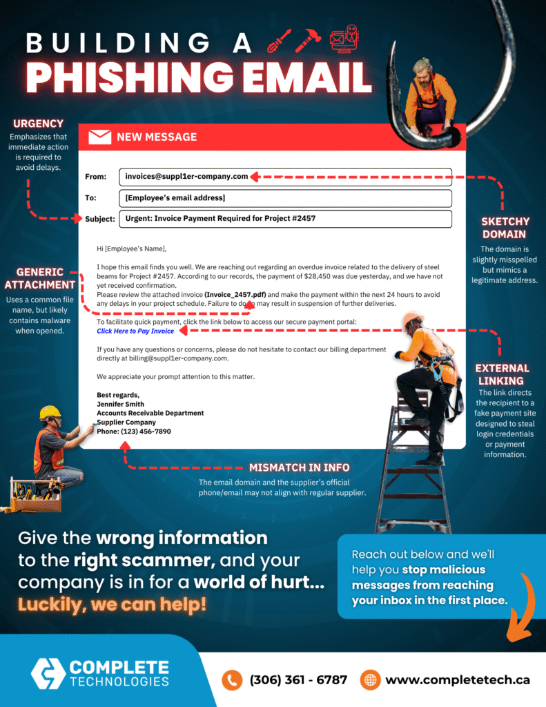 - High Turnover: Employee turnover rates in the construction sector tend to be significant; consequently, new hires may not have the knowledge to identify phishing scams effectively. You can guess the rest!